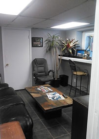 Our new and improved waiting room in second shop building features adjustable A/C, connected bathroom, TV, WiFi, Keurig coffee machine, a fridge stocked with bottled water and sodas, a fish tank, and a selection of popular auto and outdoor magazines.